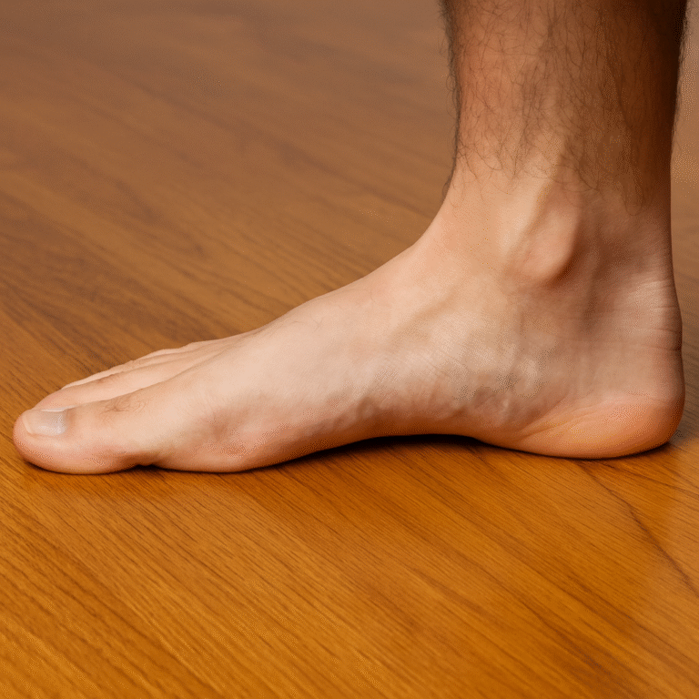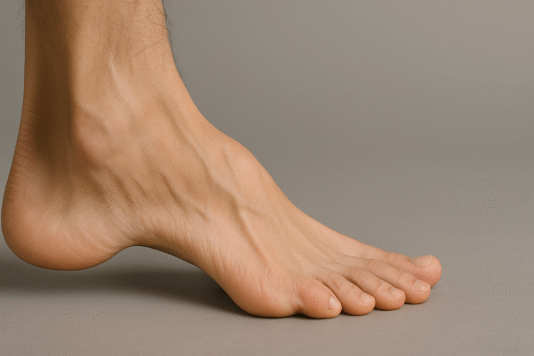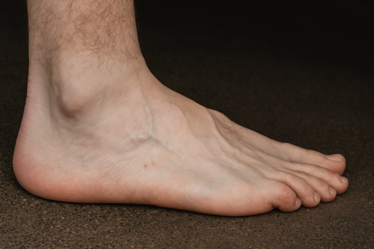 A flat foot means the arch sits low or collapses under weight. It can be present from childhood or develop through ageing, weak foot muscles, ligament laxity, injury, or weight gain. Without an arch, impact is not distributed properly.