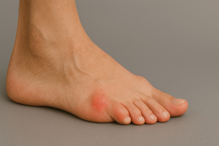 What you feel: swelling, redness, and aching at the big toe base, especially after long standing.