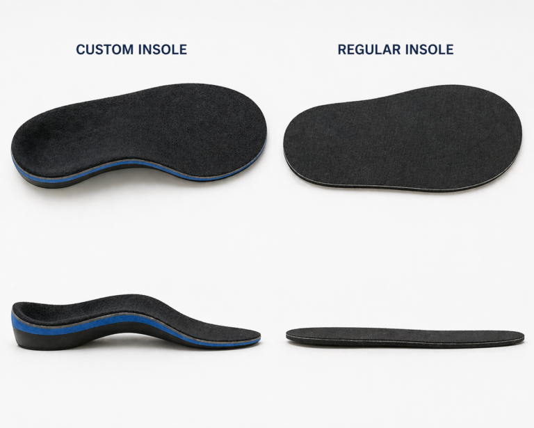 Custom insoles are made specifically for your feet based on measurements, scans, or gait analysis. They address individual biomechanical issues rather than offering general support.